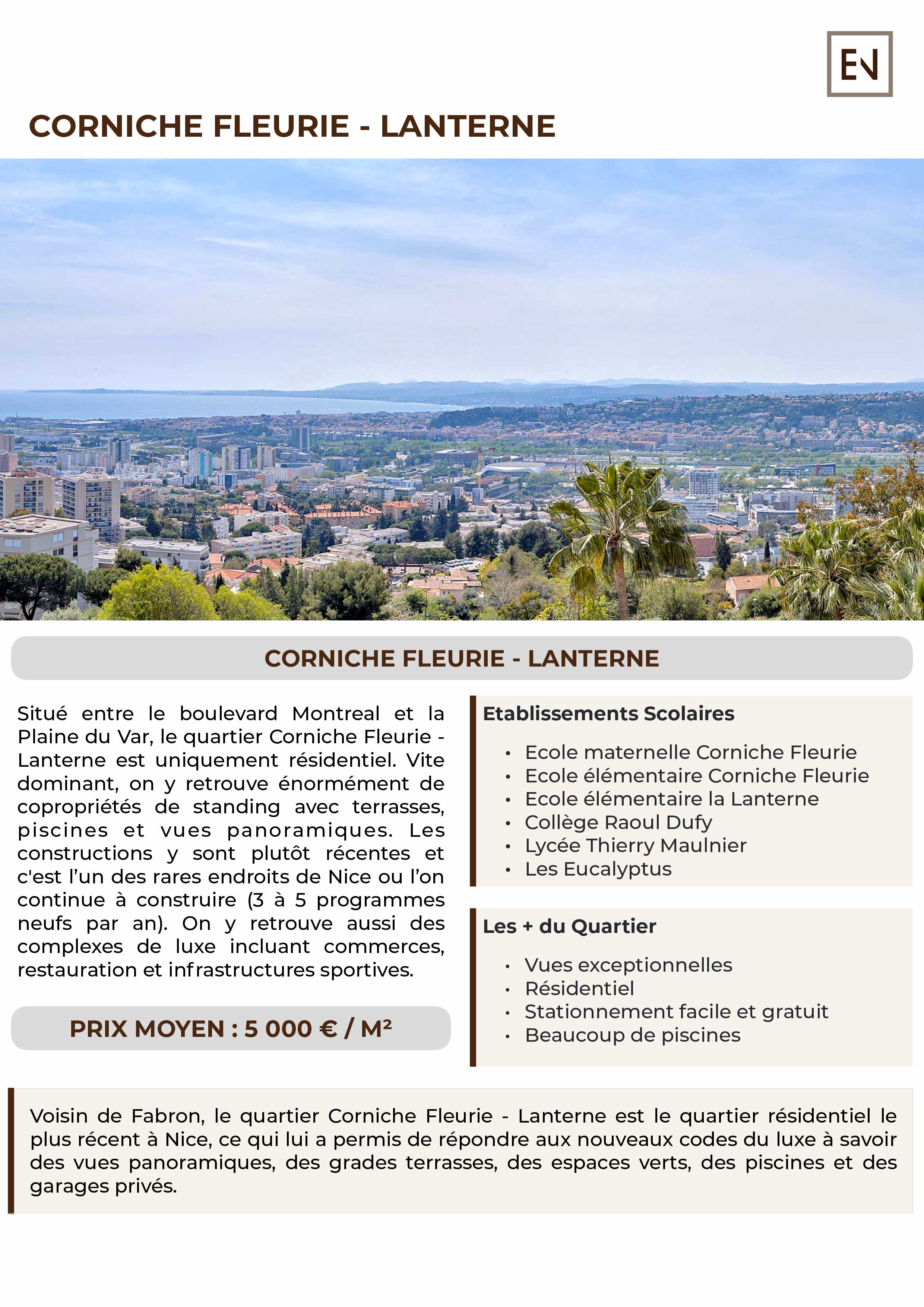 Voisin de Fabron, le quartier Corniche Fleurie - Lanterne est le quartier résidentiel le plus récent à Nice, ce qui lui a permis de répondre aux nouveaux codes du luxe à savoir des vues panoramiques, des grandes terrasses, des espaces verts, des piscines et des garages privés.