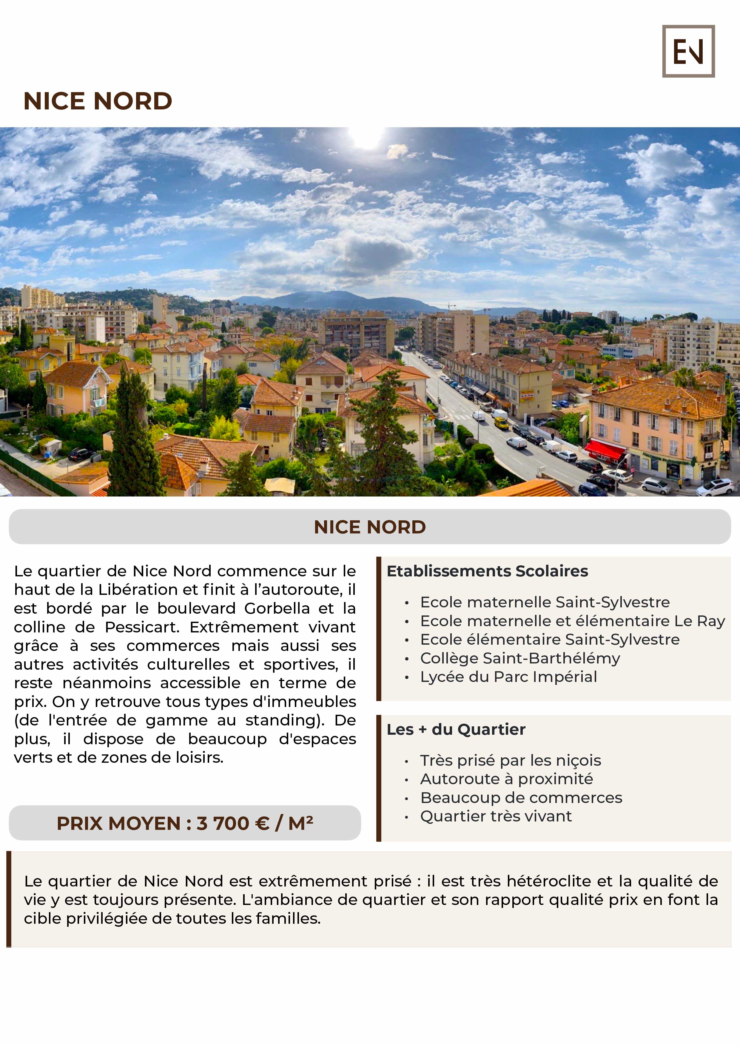 Le quartier de Nice Nord est extrêmement prisé : il est très hétéroclite et la qualité de vie y est toujours présente. L'ambiance de quartier et son rapport qualité prix en font la cible privilégiée de toutes les familles.