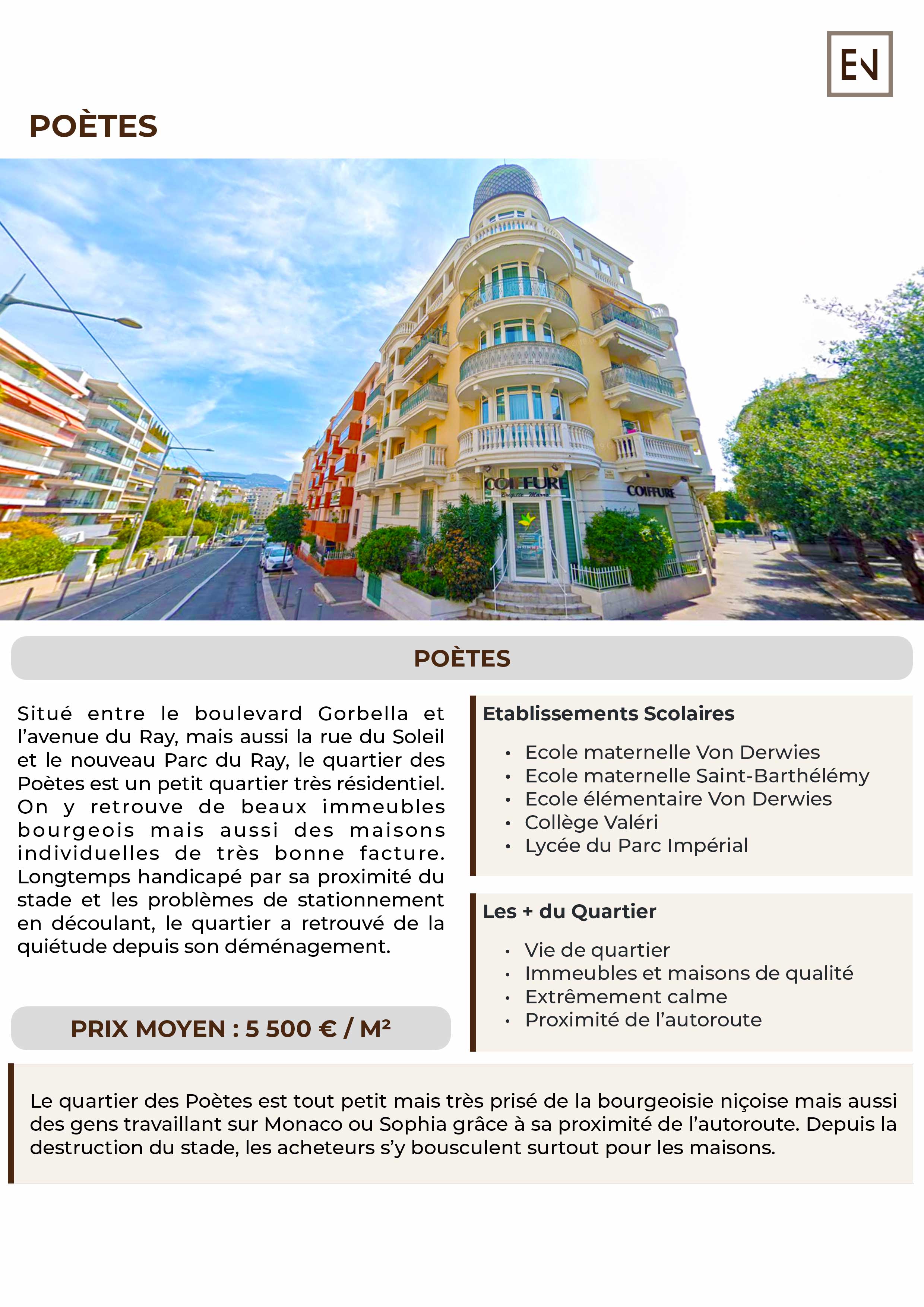 Le quartier des Poètes est tout petit mais très prisé de la bourgeoisie niçoise mais aussi des gens travaillant sur Monaco ou Sophia grâce à sa proximité de l’autoroute.