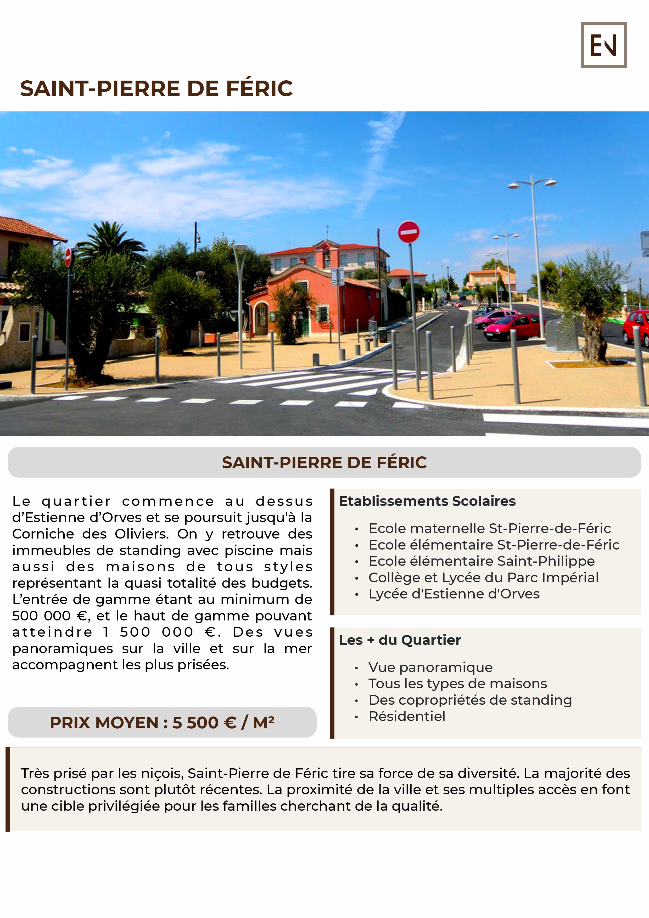 Très prisé par les niçois, Saint-Pierre de Féric tire sa force de sa diversité. La majorité des constructions sont plutôt récentes. La proximité de la ville et ses multiples accès en font une cible privilégiée pour les familles cherchant de la qualité.