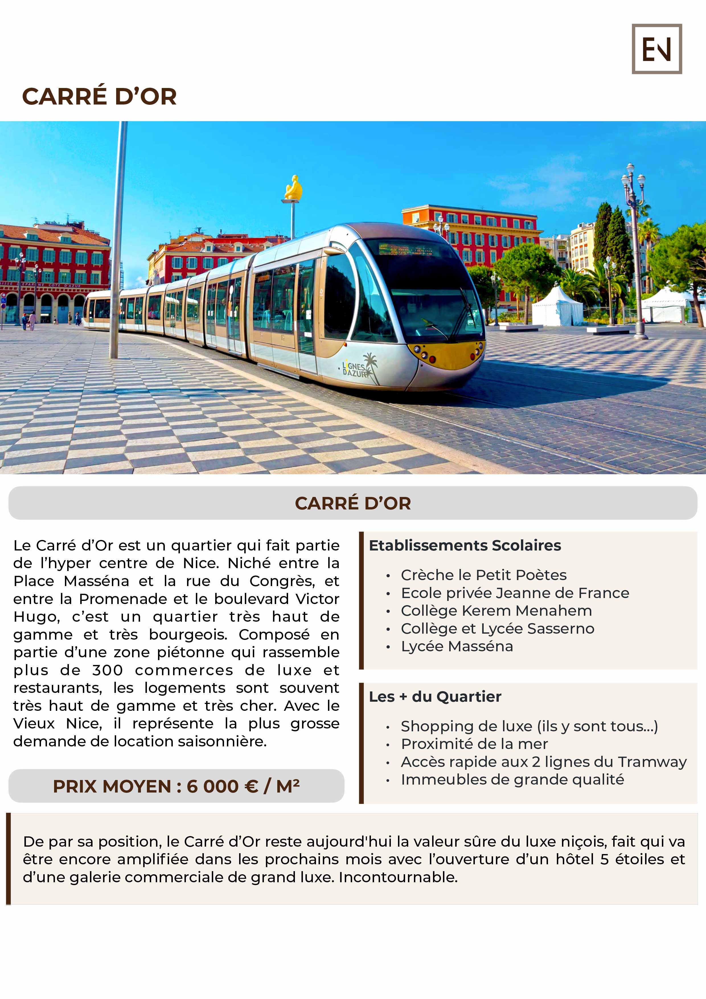 De par sa position, le Carré d’Or reste aujourd'hui la valeur sûre du luxe niçois, fait qui va être encore amplifiée dans les prochains mois avec l’ouverture d’un hôtel 5 étoiles et d’une galerie commerciale de grand luxe. Incontournable.
